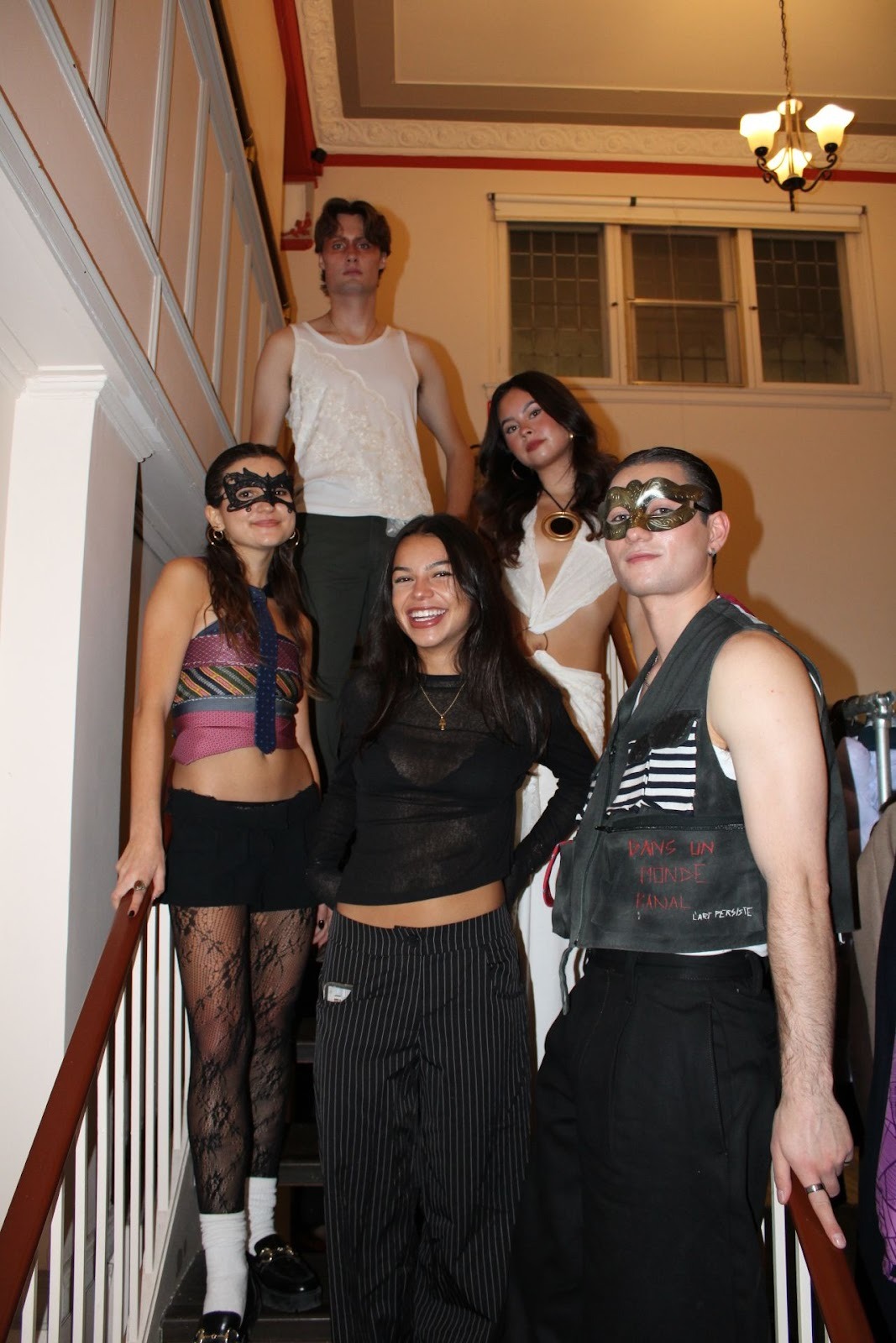 With a collection of four looks by Camila Hernandez, the theme of dream versus reality examined the corporate dread that even students seem to taste these days. The two models representing reality wore dark colours and donned mysterious masks. One model sported an off-the-shoulder top made entirely of ties, and the male model wore a vest with black-and-white striped pockets, symbolic of a mime’s costume. His vest has an embroidered quote, “dans un monde banal, l’art persiste,” or “in a mundane world, art persists.” The two other models, representing the dream-like side, were dressed in soft whites with delicate flow or dainty lace—a harsh contrast from the sharp edges of the embroidered words on the vest.